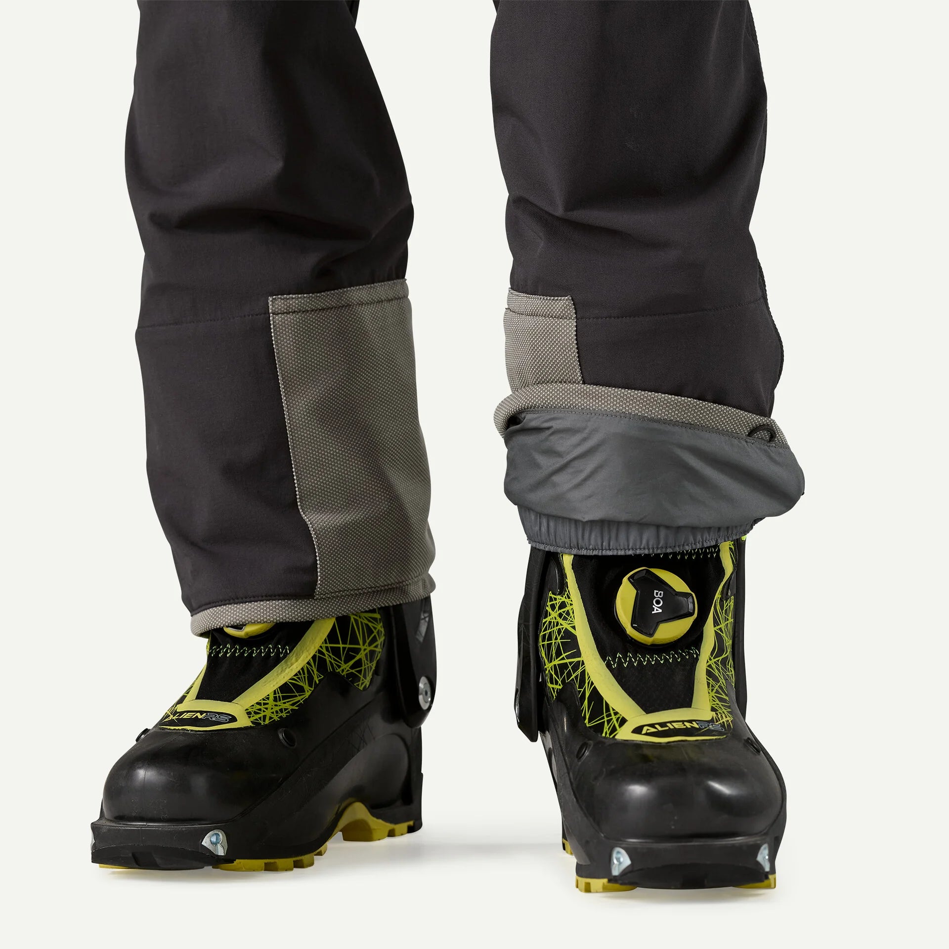 Alpine- and ski boot-compatible with zippered, adjustable cuffs that accommodate different boot sizes and secure with a snap; lightweight scuff guards protect against abrasion